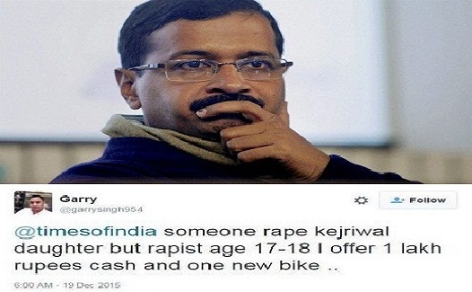 শীর্ষবিন্দু আন্তর্জাতিক নিউজ ডেস্ক: যে কেজরিওয়ালের মেয়েকে ধর্ষণ করতে পারবে তাকে ১ লক্ষ রুপি ও সঙ্গে একটি মোটর সাইকেল পুরস্কার হিসেবে দেয়া হবে। তবে শর্ত ধর্ষকের বয়স ১৭-১৮ হতে হবে। এমন শর্তে দিল্লির মুখ্যমন্ত্রী অরবিন্দ কেজরিওয়ালের মেয়েকে ধর্ষণের আহবান জানিয়েছেন গ্যারি নামের এক ব্যক্তি। সামাজিক যোগাযোগ মাধ্যম টুইটারে এই আহবান জানানো হয়।