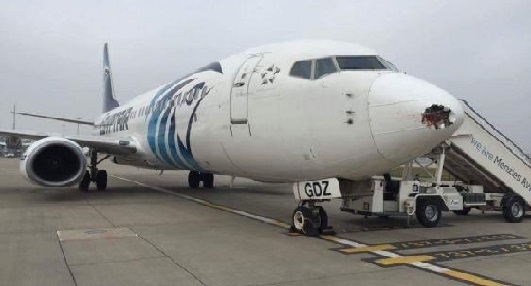 Amir Hashim, a Senior Procurement Specialist for Egyptair, posted these images on to Facebook. Mr Hashim wrote alongside the photographs:”SU-GDZ operating yesterday evening’s MS779 arrival suffered a bird strike on approach.